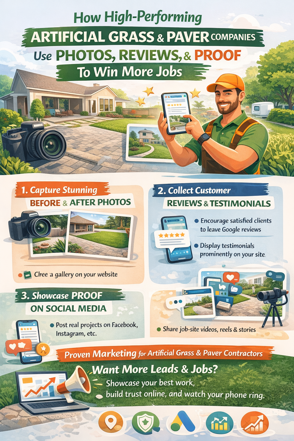 This is why trust signals—photos, reviews, testimonials, and proof of work—are no longer optional. They are the foundation of modern artificial grass and paver marketing.